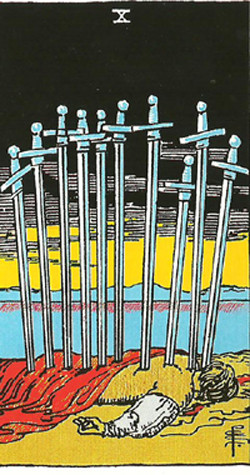 Desetica mačeva je zadnja karta zračnih aduta, što znači da u sebi nosi ideju koja se tek pojavljuje, i koja će se manifestirati u adutima elementa zemlje, a to su diskovi.