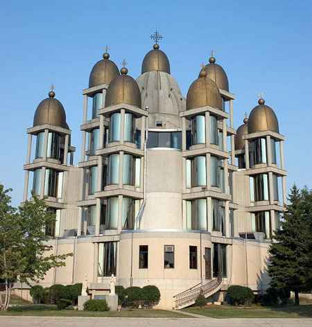 The St. Joseph The Betrothed is an Ukrainian Greek-Catholic Church in Chicago. Built in 1956, it is most known for its ultra-modern thirteen gold domed roof symbolizing the twelve apostles and Jesus Christ as the largest center dome. The interior of the church is completely adorned with byzantine style icons (frescoes). Unfortunately the iconographer was deported back to his homeland before he was able to write the names of all the saints as prescribed by iconographic traditions.