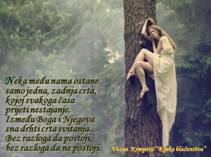 Internetom odavno kruži parabolična priča VOZ ŽIVOTA. Ovo vam pričam zbog toga što mi se čini da je riječ o sličnoj metafori i u poruci koju nam u današnje tihovanje donosi pjesma iz “Bijele kule”. Opširna je priča o veličini kniževnog opusa Vesne Krmpotić (čuđenje se najčešće izrazava pitanjem KAD JE SVE TO STIGLA DA NAPIŠE?) ali, očito je, da Vesna nije časila časa da slijedi jarku snagu nadahnuća, pa je pisala i u vlaku, i u autobusu, i u zrakoplovu – lično sam svjedočio - i na brodu, riječju sve njezine druge aktivnosti bile su samo “mali odmori” od pisanja. Nego da se vratim na pomenutu metaforu u navedenoj pjesmi – sve, sve, ali me oborila s nogu finalna rečenica danasnje pjesme – SASLUŠAJ ME NA TRENUTAK, VJEČNOSTI: