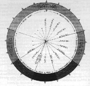 Sri Yukteswar kaže da je centar Satye Yuga bila 11501 godine prije nove ere. Edgar Cycle daje 12000 godina prije nove ere kao datum kad je Atlantida potonula u more. Prosvjećeni Atlantiđani koji su pred vidjeli pad Atlantide i poplavu su izgradili velike brodove i migrirali u Egipat (i drugdje), gdje su bili primljeni kao sinovi božji. Sa sobom su donijeli darove Egipćanima kao što su astronomija, matematika, glazba, arhitektura i medicina. Također se vjeruje da su idruge kulture kao Tibetanska, Maje, Jevreji, Kelti, Havajska Kahuna i Hindu imale isto porijeklo.