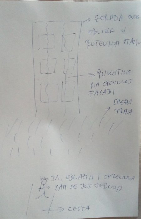 Vidim jednu zgradu, staru, visoku, raspuknutu, oronulu sa pukotinama, napuštenu, ali ne srušenu, stoji na osami – na nekoj livadi, oko nje nije zelena trava, već neka smeđa...kao na uvodnoj slici (zgrada nije ista kao na uvodnoj slici, već ovakvog oblika kako sam nacrtala).