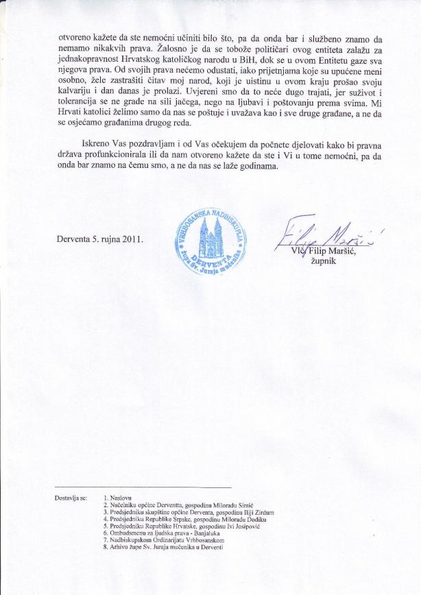 MARŠIĆ: U zadnjih šest godina koliko sam u Derventi prvom čovjeku općine uputio sam više dopisa, zašto imam i dokaze, jer je svaki zaprimljen na protokolu, nažalost niti na jedan nisam dobio ni odgovor, a kamo li da bi se nešto konkretno pomoglo. U tim dopisima tražio sam da nas općina predvidi u budžet kad je u pitanju obnova crkve, organizacija međunarodne smotre folklora. Nikada nisam dobio niti odgovor, a o parama nema niti spomena. Općina je odmah iza rata dopustila jednom lokalnom moćniku, koji je naravno s vlastima u sprezi da napravi kafanu koja je cijelom svojom dužinom se naslonila na katoličku crkvu, te je zatvorila jedan od ulaza u crkveni prostor. Do danas je doneseno 10-ak rješenja o rušenju te kafane, ali općina nikada nije sprovela niti jedno rješenje. Tražio sam od općine da nam se vrati zgrada samostana časnih sestara, koja je bila i prva učiteljska škola u BiH, te je za vrijeme komunizma oduzeta, te crkvena zemlja u centru grada. Do danas od toga ništa, dok je pravoslavnoj crkvi vraćeno sve što joj je u vrijeme Jugoslavije oduzeto, te je čak dobila i ono što nikad nije bilo njezino. Mi ne tražimo za sebe extra prava, nego samo da imamo jednaka prava kao i drugi u ovom gradu, jer naši korijeni su duboko zasađeni u ovoj pitomoj posavskoj zemlji i želimo da nas se tako tretira, a ne da se prema nama ponaša kao da ne postojimo. U oćpini Derventa prije rata većinski narod su bili Hrvati, međutim srpska politika je još prije rata nastojala to razbiti, dodjeljujući neka hrvatska sela općini Doboj, a neka srpska iz općine Prnjavor, općini Derventa.