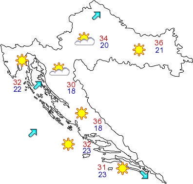 Pretežno sunčano i vruće, u mnogim krajevima vrlo vruće. Poslijepodne samo ponegdje uz granicu sa Slovenijom moguć jači razvoj oblaka, ali je mogućnost za pljuskove i grmljavinu vrlo mala. Vjetar slab, poslijepodne ponegdje i umjeren jugozapadni, na južnom dijelu Jadrana sjeverozapadni. Jutarnja temperatura uglavnom između 17 i 22, na Jadranu od 20 do 25, a najviša dnevna od 31 do 36°C, u gorju malo niža.