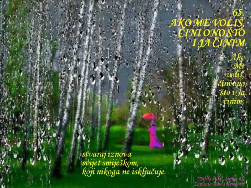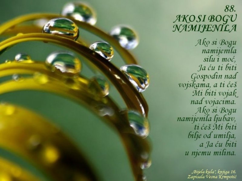 Kako je računanje vremena ljudska konvencionalna tekovina pokazuje pjesma iz "Bijele kule" za današnje tihovanje. Mene u tom primjeru, najviše oduševljava snaga imaginacije, bliže rečeno, majstorstvo artikulacije tolike svjetlosti u riječi. A Vesna Krmpotić, poput malog Božjeg sluge, kaže za sebe da je samo ZAPISIVAČICA. Za nas, čitatelje, još jedan uzorit primjer poniznosti: