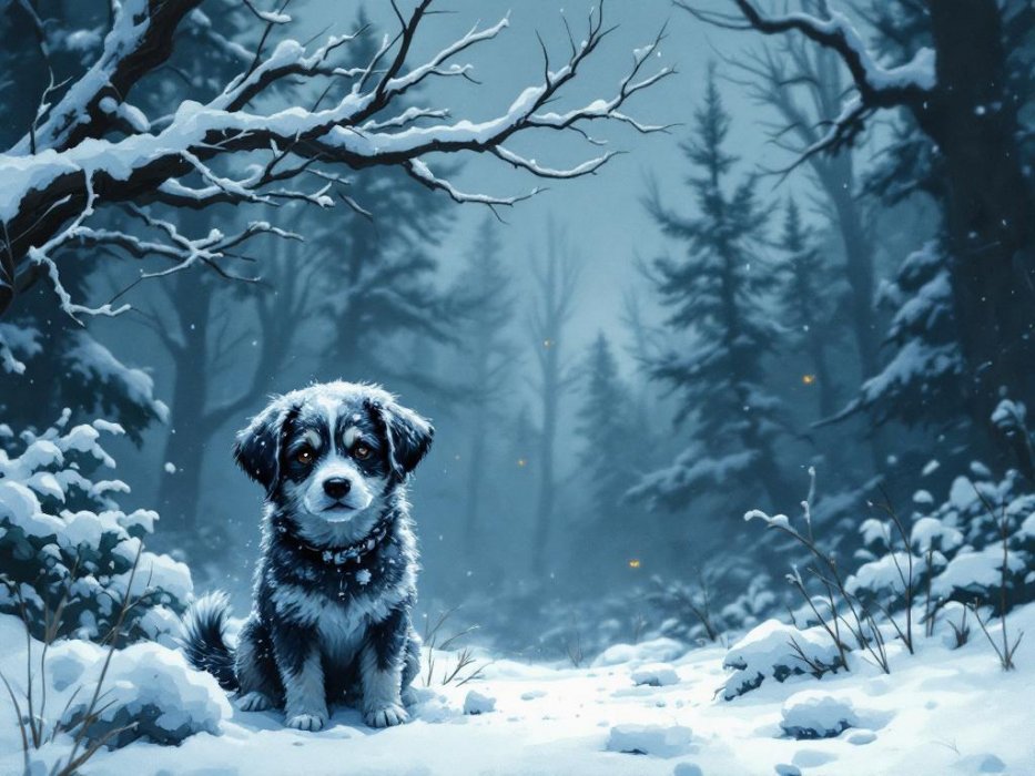 U dubini zime, ondje gdje snijeg nije bjeloća nego pritisak koji ulazi u kosti i zadržava se ondje kao kriva misao, mali psić stoji na rubu šume poput bića koje je svijet jednom izgovorio pa ga se, u strahu od vlastite odgovornosti, odrekao. Ne stoji mirno, ali se ne miče, zadržan je između koraka koji su otišli i tame koja još nije odlučila hoće li ga primiti. Zrak je tvrd, miriše na metal i smolu, na koru drveta koja pamti udarce i šuti o njima. Nema drame, nema geste. Samo odsutnost koja se širi brže od hladnoće i zauzima prostor u tijelu.