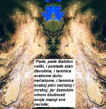 I povika jakim glasom govoreći: "Pade, pade Babilon veliki, i postade stan đavolima, i tamnica svakome duhu nečistome, i tamnica svakoj ptici nečistoj i mrskoj; jer žestokim vinom bludnosti svoje napoji sve narode;  Otkrivenje 18,2