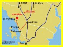 Ako dolazite autom iz pravca Rijeke ili Pule, nakon Vodnjana krenite prema Trstu. Na četvrtom kilometru sljedite prometni znak "Mednjan". Bijelom cestom nakon trećeg selca skrenite lijevo 300 m do crkve sv.Foške. Autobusom se može doći jedino od Vodnjana preko Peroja prema Barbarigi do prometnog znaka "Batvači" gdje se ostavlja autobus i pješači desno do crkve 300m.