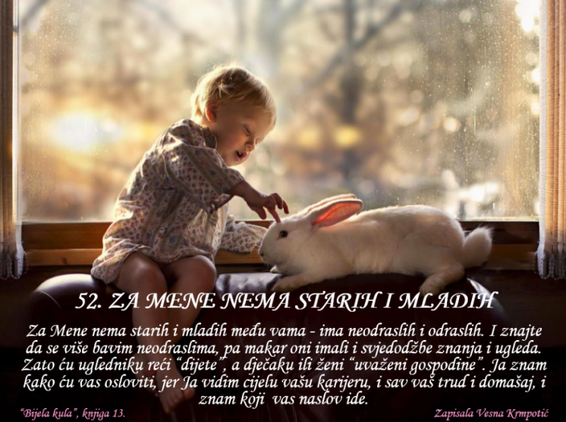 Draga mi je ova poruka iz "Bijele kule". Zašto? Zato što govori o učinu na način već formirane narodne mudrosti SVE ŠTO RADIŠ, SEBI RADIŠ! Ali i zbog jednog stanovišta (da ne kažem paradigme), bolje reći, uvida da naša POTREBA ZA VREMENOM, NJEGOVA JE JEDINA PRIGODA DA SE UOBLIČI: