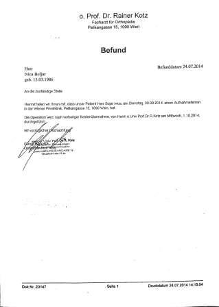 spreman je izvesti operaciju, Wiener Privatklinik, prof. dr.Rainer Kotz. Prof. Kotz je pregledao Ivicu i prihvatio napraviti zahvat.