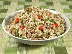 Sastojci: 2 šalice riže, 2 šalice pistacija, žlica grožđica, malo mljevenog cimeta, maslinovo ulje za pečenje, 1/2 zelene i 1/2 crvene paprike