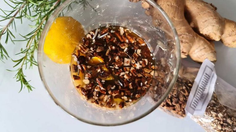 U čistu teglu dodati suhi korijen maslačka i čička. Đumbir sitno naribati na ribež i dodati u mješavinu. Organskom limunu oljuštiti (najbolje s gulilicom za krumpir) tanki žuti sloj pa i to dodati u teglu. Ako nemate grančice ružmarina, možete naravno koristiti i suhi ružmarin. Sve zalijte rakijom i držite od 4 tjedna na tamnom mjestu. Povremeno promiješajte. Nakon isteka vremena, procijedite i pohranite u prikladnu bočicu s kapaljkom.