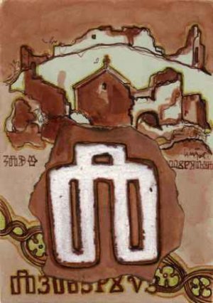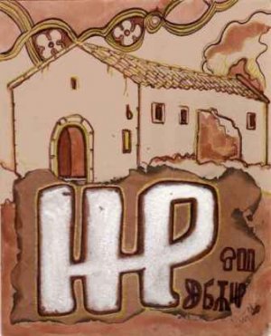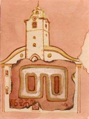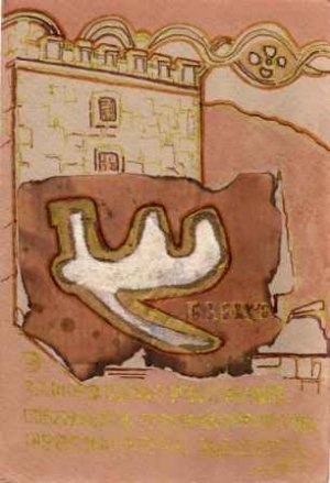 Crikvenica - paulinski samostan, znak frankopana te slovo P - povijest piše u kamenu glagoljica, u pozadini motiv iz hrvatske povijesti - Zadar - i simbolika hrvatski vladari.