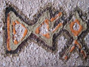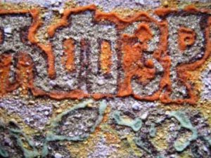 Iz ciklusa Glagoljska slova i imena, glagoljsko slovo P, na pjeskarenoj podlozi u kombiniranoj tehnici, detalj slike, 2008.,