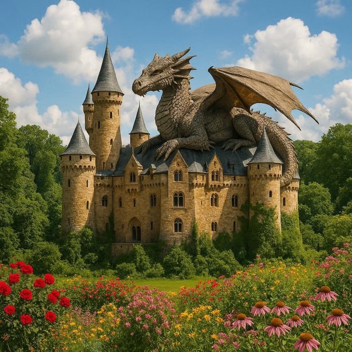 Pošto su zmajevi u legendama i mitovima zauvijek povezani sa kraljevskim lozama, dvorcima i otetim djevama (čitaj otetom ljepotom), na našim stranicama ćete naći puno slika dvoraca, naši autori su voljeli tu simboliku...🏰